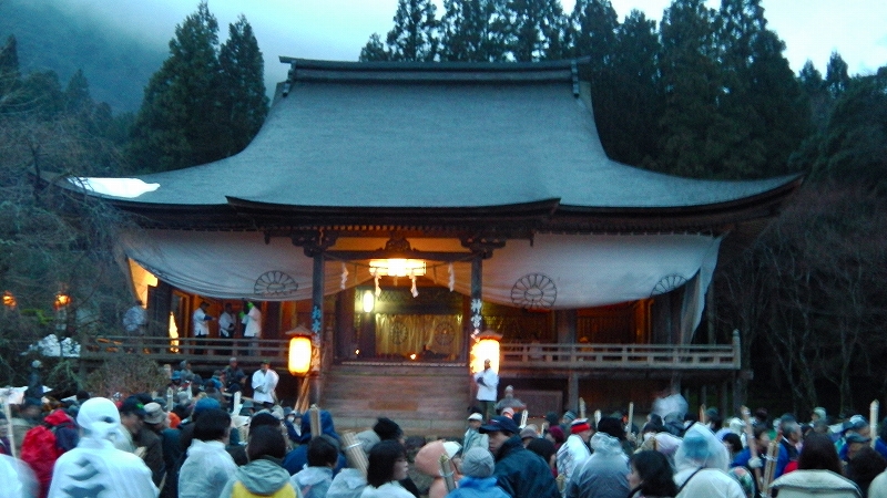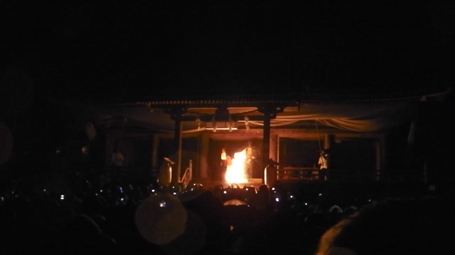 長い読経が終わると社内で炎が上がり、赤装束の層が松明をかざす達陀が行われる。