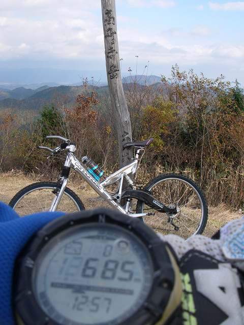 登山口には神戸No大阪Noの車が2台。しばらくはコンクリートの林道ですがすぐに登山道が始まります。ここから山頂までは乗車率は消費税分の5%?尉ヶ畑峠から少しの間の林道以外は全て押しか担ぎで、いや、引きずり揚げると言うのが正解か(笑)、12時57分に山頂へ到着。