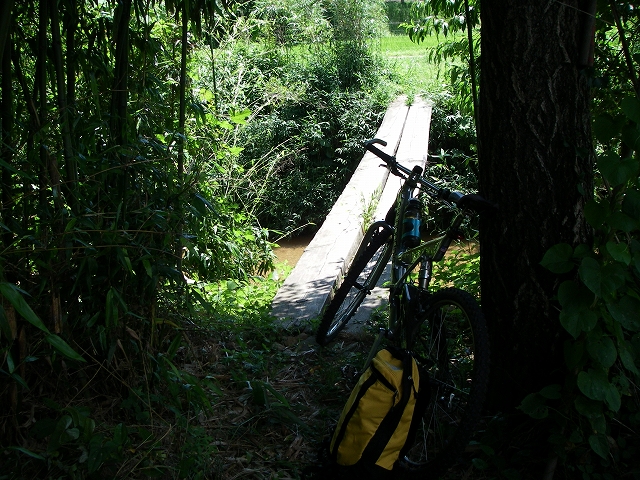 丸太を割って渡しただけの、超素朴な橋が架かってるのが見えたので、迷わずUターンして小休止。