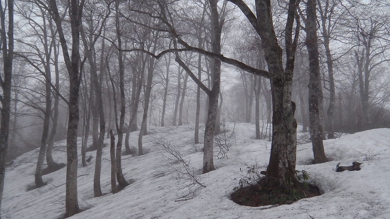 天気はガスガスで、猿倉台地に上がっても全く展望無し。しかも時々雪模様・・
