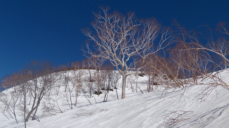 疎林の斜面をテン場に向って滑り降りる。本日の行動はこれだけ(笑