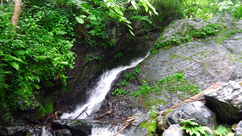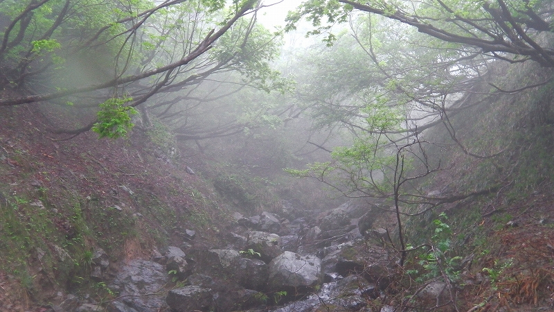 予報は曇りだったが時々雨足が強くなる中、湖北高島トレイルの三重嶽(さんじょだけ)974.1mに突きあがる石田川の間谷(あいだに)を遡行した。