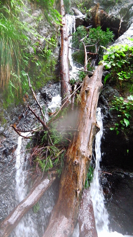 とりあえず、直径が30~40cmはあろうかという大木が根っこごと谷に横たわったり、折れた木々が滝を完全に埋めてしまっている。