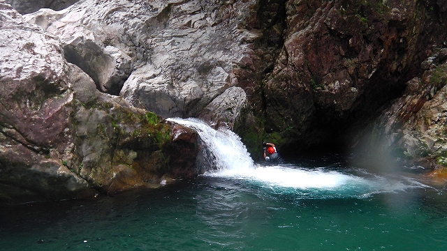 早速7m滝の釜を泳ぎ右の水際を登る。