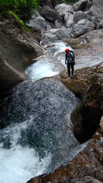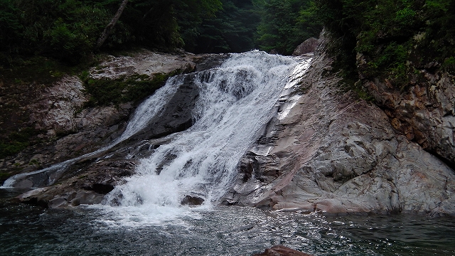 15m斜瀑は右岸から左岸に滝の流れの中を渡り左岸を登るが、結構ツルツルで四つんばいになって登った。