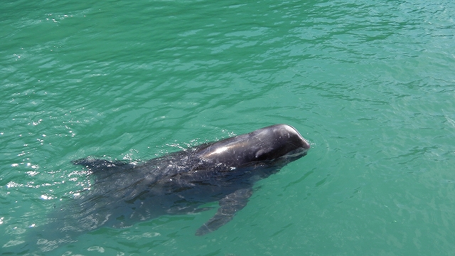 ひとなつこい小型のクジラでコビレゴンドウクジラと戯れ、イルカショウを観たあとは・・