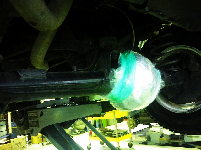 リアデフキャリアを外したまま雨の中帰宅しないといけないので、ホーシングをビニールでグルグル巻きにラッピング(笑