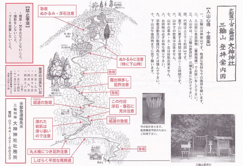 受付で言われることは、「三輪山は大神神社の御神体です。決して興味本位やハイキング等の目的ではなく、信仰の気持ちでお登りください。」もちろん「ハイ」です。