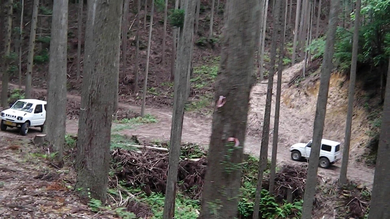 この絶景ポイントで我々は7台の車を少し広くなった林道の脇に寄せて絶景を楽しんでいたのだが、そこに現れた格好もイケイケオフローダーのバイク野郎がごっつい勢いでアクセルを吹かして通り過ぎて行った。