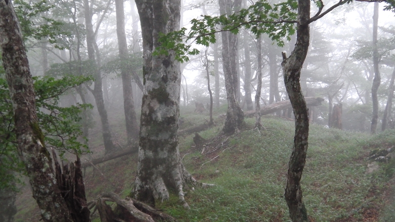 とりあえずもうすぐそこに稜線が見えるからと更に登ると、13時51分そこにはブナ林が広がる美しい稜線があった。が、道は無いしガスで展望も無い・・