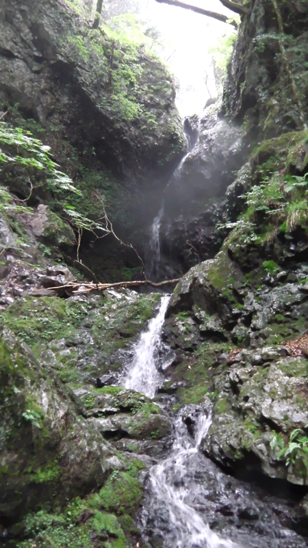 少し前からK上さんが遅れていたので、このまま谷を詰めるか左に逃げて稜線まで近道するかと協議。結果左から入る枝にルートを決めて、手がかり豊富だが高度感たっぷりの水が切れかかった滝を登り、その後は自然林の中を黙々と高度を上げる。