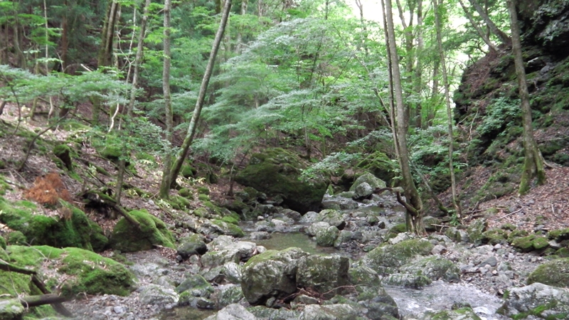 しばし杣道を辿り再度入渓するが、特に見せ場もなく10時45分朽ち果てた植林小屋のある1:1の二股に。これは左股の地蔵谷に進路を取る。