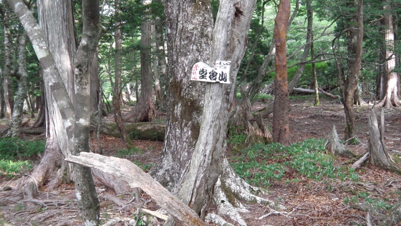 のっぺりとした山頂は原生林に囲まれ展望無し。