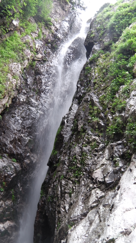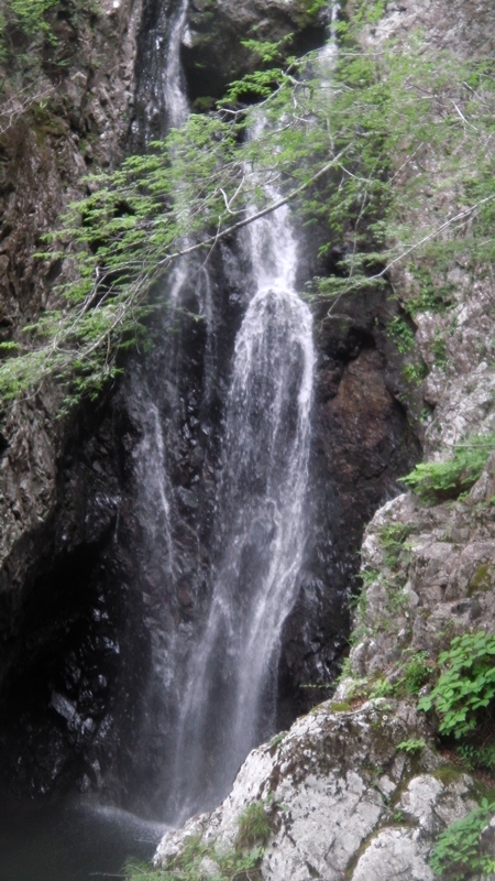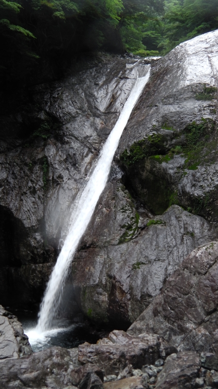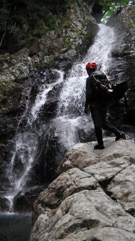 ツルンツルンの岩壁の窪みを一直線に深い釜に落ちる姿は圧巻でしばらく見とれるが、いつまでも見とれてちゃ逝けない。突破は右のルンゼを登り巻いたが、ルンゼ上部の岩の乗り越しがイヤラシかった。