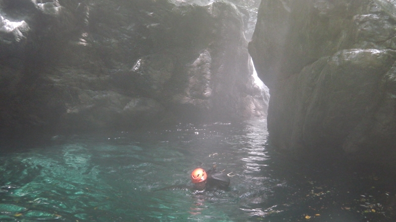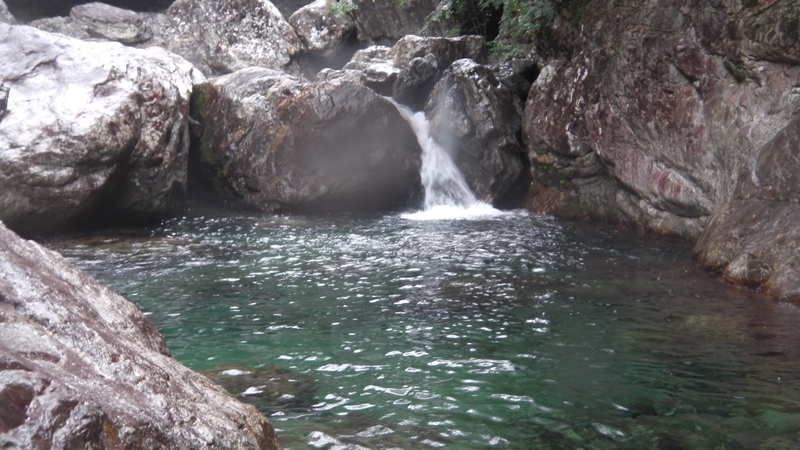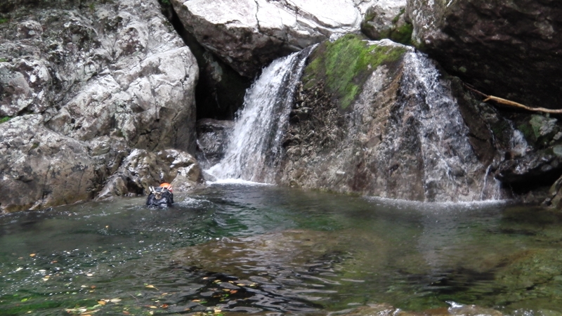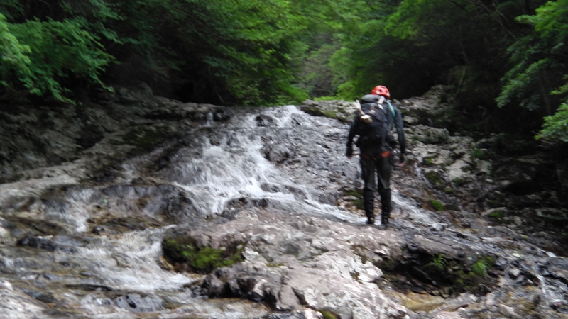 透明な流れのミニゴルジュとなり、ウオータースライダーを楽しんだり冷たい釜に飛び込んだり、楽しみながら下る。