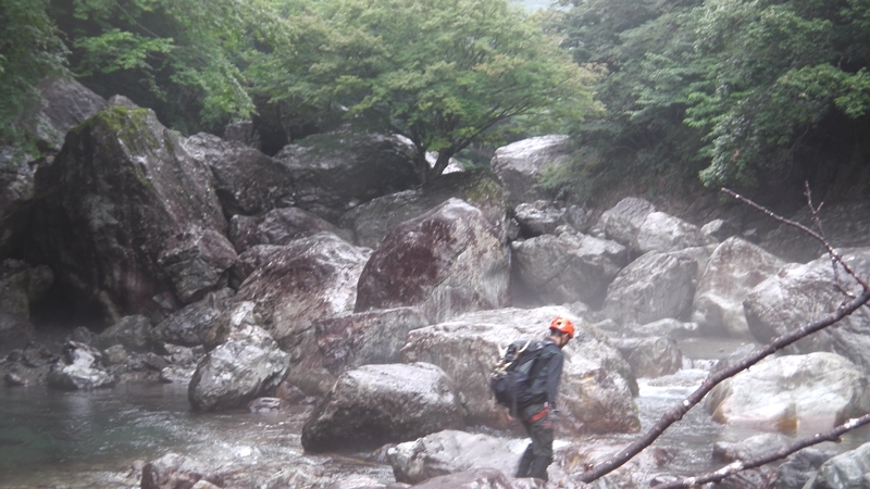 この後、谷の傾斜が緩むと伏流水となり、軽自車から小型トラックサイズのの巨岩がごろごろする。
