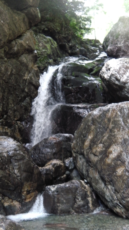 やがて西ノ滝に近づき、谷がグイッと右に曲がると西ノ滝と中ノ滝との合流点。これを過ぎてシオカラ谷に入ると水の流れは1/3に。