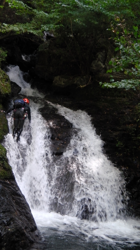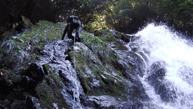 岩間の2mは滝裏に潜り込んでルートを模索する。