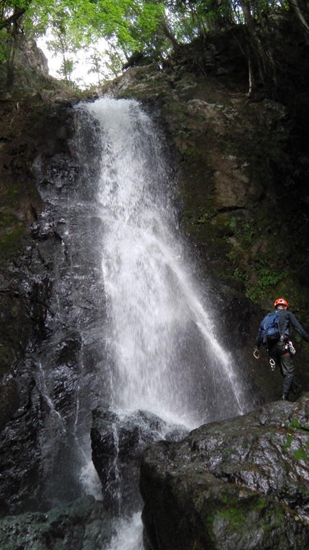 岩場にはFIXロープが下がっててラッキー。その後は高度感のある木の根バリアフリーと、最後の落ち口への乗り越しが絶妙な緊張感でこの谷の最後を締めくくった。