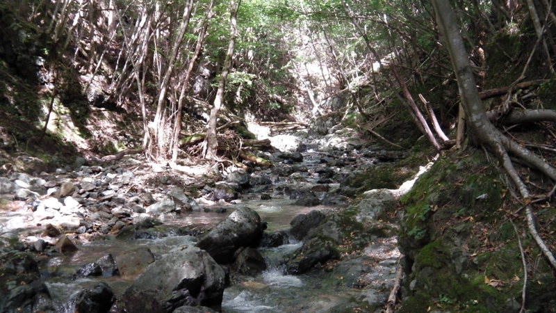 資料にはこのまま進み登山道を使って集落に下りるとあるが、それぢゃ面白くない。我々は右岸の植林帯にルートを取り直上する。が、、ここでコンパスを忘れた事に気づく(汗・・
