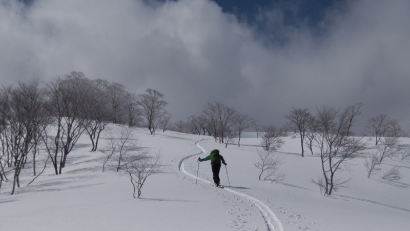 僕らの進む方向にはストックの跡からしておそらく3名の先行者のみ。前回推高谷左股に下りた個所を右に見て、どんどん稜線に向かって登っている。ザラメの 上に乗っかってる水分を含んだ重めの新雪は約15~20cm。今回は薙刀平を横断するのはパスして先行者におんぶにだっこ?そのままありがたくトレースを使わせ ていただくことにする。