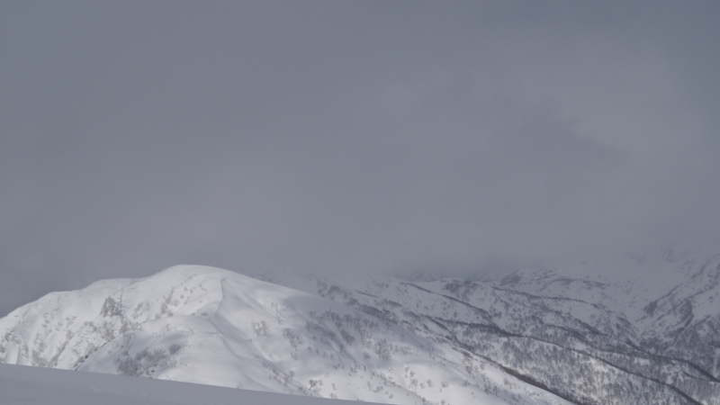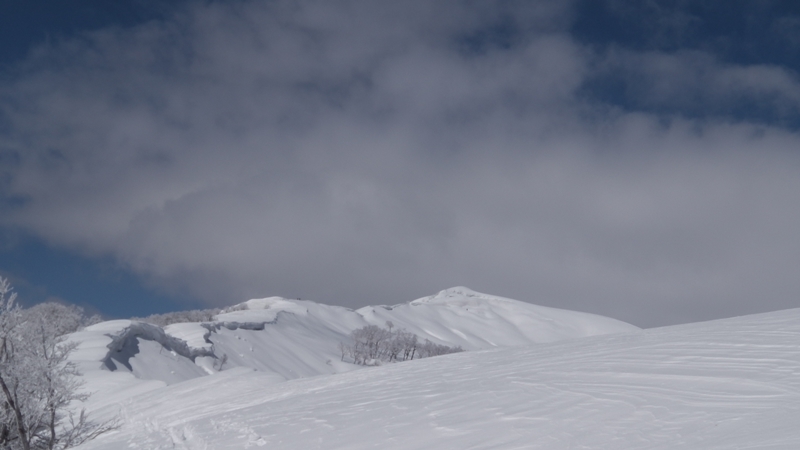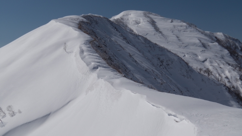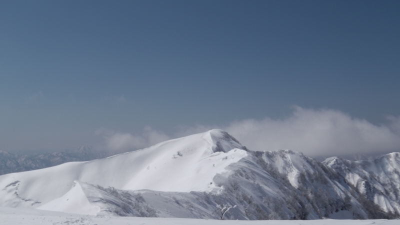 標高が上がるにしたがってしんちゃんのシールの調子も戻り、彼のペースが速くなってくる。僕のペースは逆に遅くなってくるのに・・そんなこんなで雪庇の張った稜線を進む事暫く、ソロと2名パーティーの先行者が薙刀平の端を滑り降りて行く。なかなか雪は重そうだ。