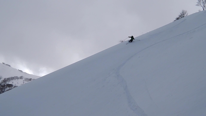 南面を薙刀平に向けてドロップイン。重い新雪だかスキーはよく走る。思ったより快適だ。