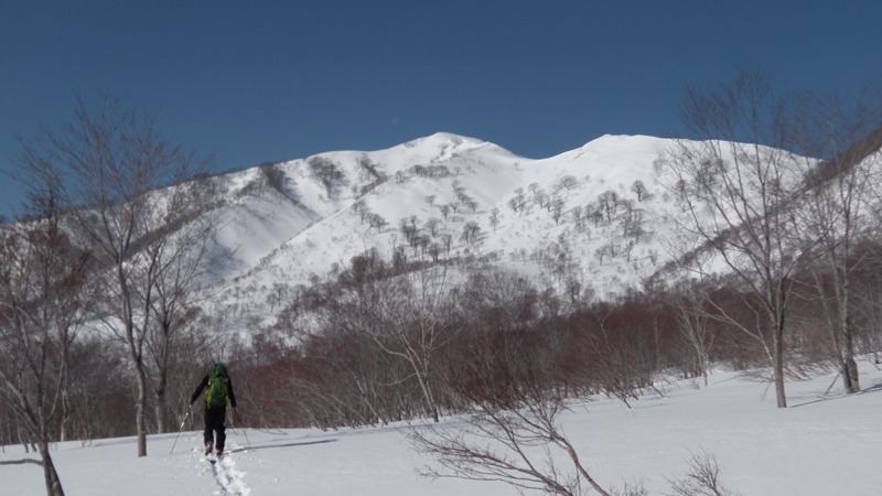 7時30分、先ずはダイレクト尾根末端に向けて出発。雪に覆われた湿地帯を抜けて尾根に上がる。この辺りは素晴らしいブナ林が広がっていたが、あまりの素晴らしさに写真を撮るのも忘れていた・・・。