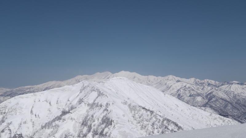 東尾根から来た登山者のトレースが続いているが、僕らはここから先への行動はストップにした。その内に石徹白川俵谷を詰めてあそこに立とうと約束したのだった。十数年前に時間切れで立つことが出来なかった沢山行のリベンジだ!