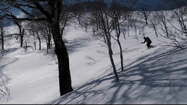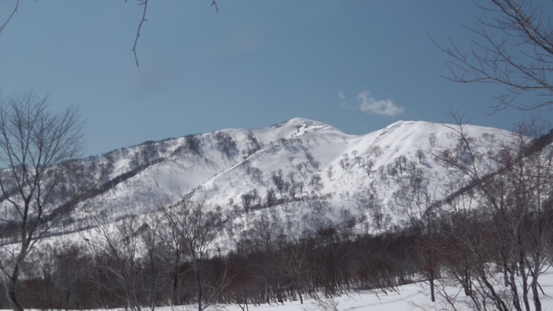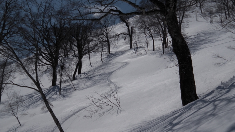 北峰から北側に少し戻った鞍部からのルンゼを狙っていたが、あの尾根上の氷化した斜面がイヤな感じなので、東尾根上を少し滑り疎林のルンゼにドロップ。