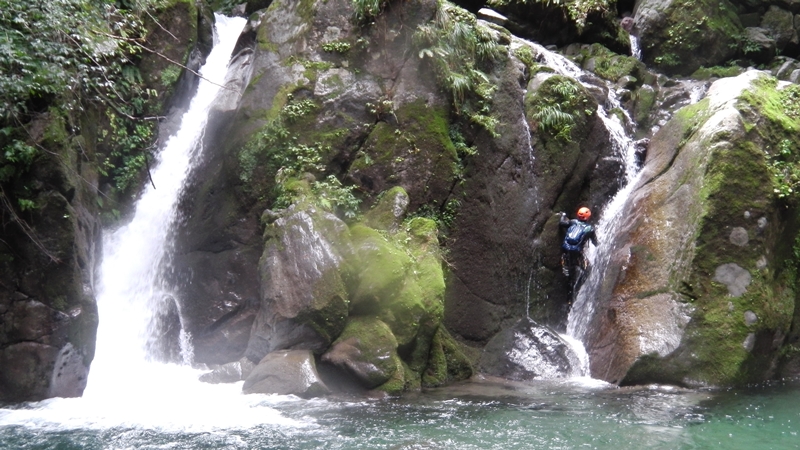 右岸から落ちる滝の横のズルズル斜面を巻いて懸垂で再び降り立つ。