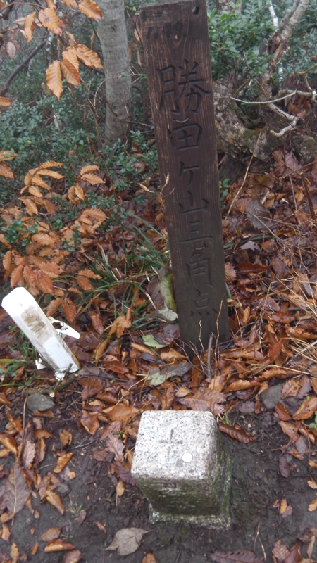 10時49分、木々に囲まれて全く視界のない・・まぁ木々に囲まれてなかったとしても濃いガスの中なのだが・・勝田ヶ山に到着。