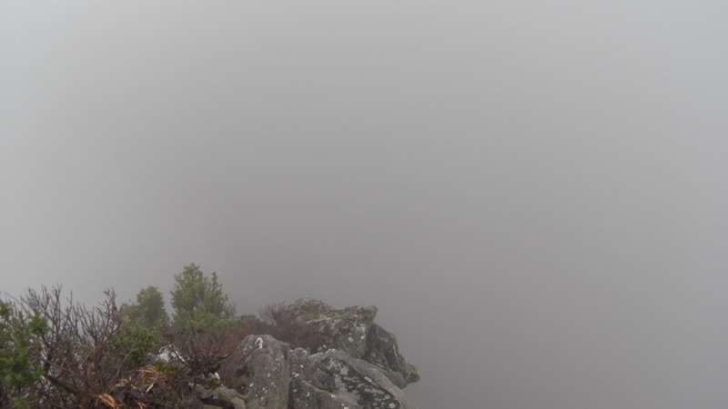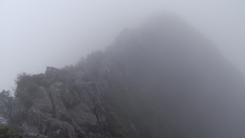 雨に濡れて滑りやすい岩が折り重なる稜線に一歩を踏み出す。両側は100m以上の断崖絶壁!のはず・・真っ白でな~んも見えないから高度感もなんも感じられない。がっ、滑ってバランスを崩したらこの世とはおさらばなのには変わりないので慎重に進む。しかしホント濡れた岩場にビブラムソールは良く滑るわぁ。