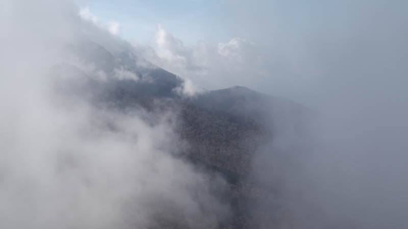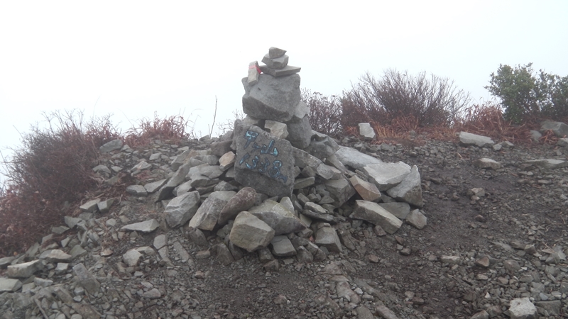 山頂を後にして直ぐ、ここまで綺麗に整備されていた登山道が一変した。深い所では胸辺りまである太い笹に覆われ、掻き分けるように進まなくてはいけない。しかもその笹は雨に濡れているのでアッという間にずぶ濡れ必至・・10m程進んで引き返し、三角点に足を置いて雨具上下を着込んで笹漕ぎ開始。藪の中に続く登りを黙々と進むと11時34分それは現れた!
