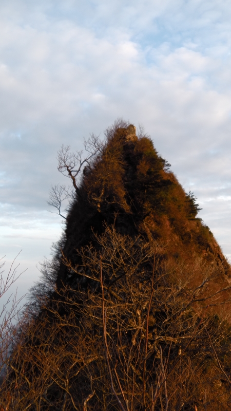 6時38分、野田ヶ山1344.0mに到着。日の出前に到着できたが山頂からは灌木に阻まれてここで拝むのは無理だ。少し戻って10分その時を待つ。