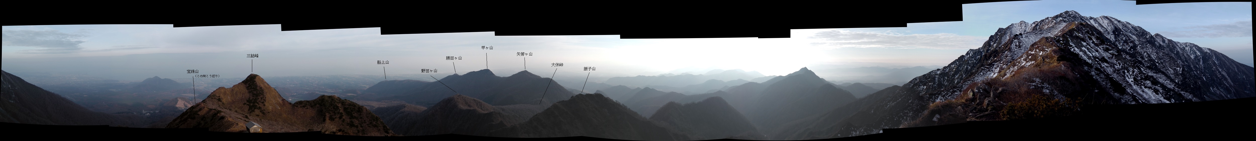 8時21分、登山者2名が休憩している三鈷峰1516mに到着。ここも360度の大展望だ。このあと向かう宝珠尾根が眼下に続いている。
