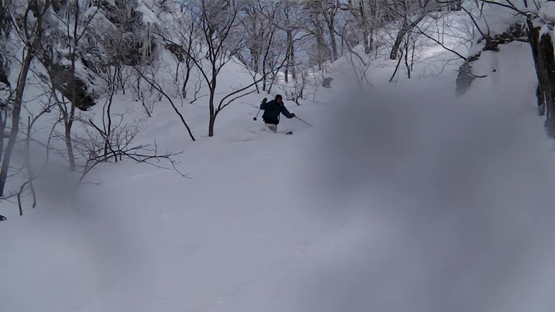 上部はそこそこの雪質だったが立木の急斜面で滑りはイマイチ。