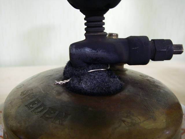 この123Rは、燃料タンクの上の窪部部分でエスビットと か、チューブ入りのゲル状着火剤なんかを燃やしてプレヒートします。最初の頃は私も真面目にそうしてましたが、窪みの上の首部分に綿のひもを巻きつけ、使用前にタンクの中のガソリンをスポイトで少し頂戴して、ひもに染み込ませたらそれに着火。でプレヒート完了。という方法に変更しました。しかし、このひも の巻き方が難しく、タンクを暖める効率に欠ける装着しか出来ないんです。結果ガソリンの無駄使いが発生しておりました。