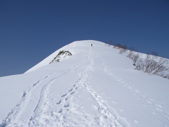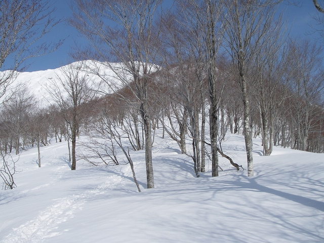 やっとの思いで(大げさ)尾根上に出たら、気持ちいいブナ林の中をスキーを履いてハイクアップ。