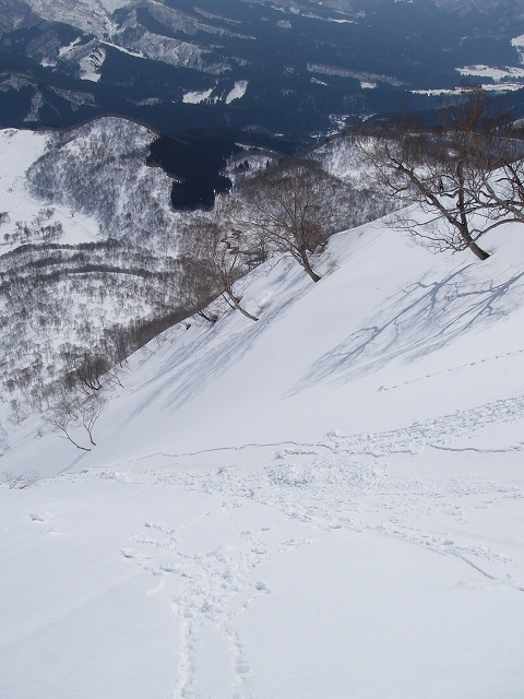 今日は一人なので無理はしまいと思ってたのだけど、50mほど下ったところでソロの山スキーヤーのおじさんと話してるうちに・・