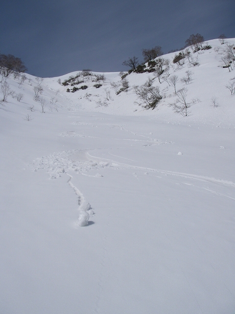 急斜面の出だしを2ターンしたら足元が動き、5cm位の層が音を立てて落ちて行きます。