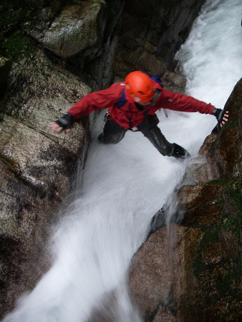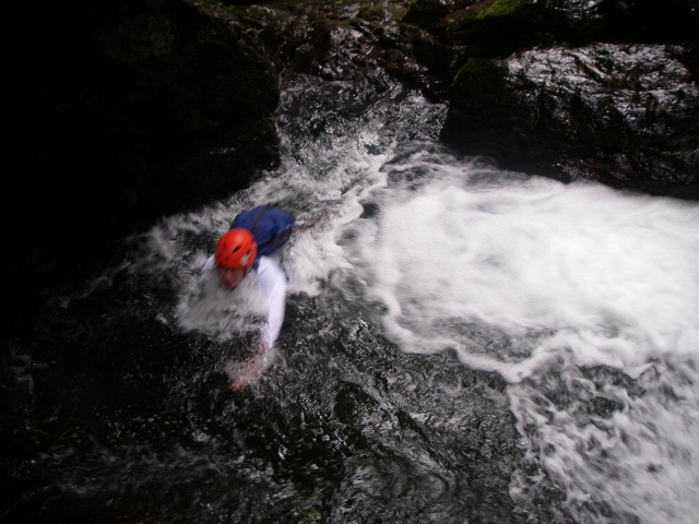 岩溝の中も白泡が沸く流れを跨いで「マタが裂ける~ッ」との叫び声も、激流が発する音にかき消されて聞こえない。