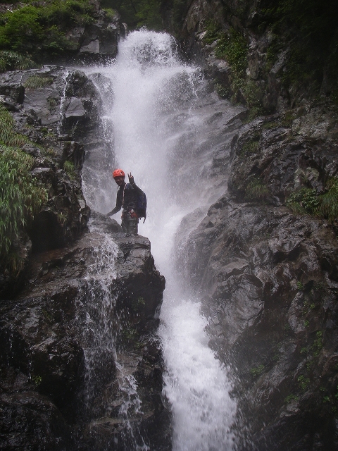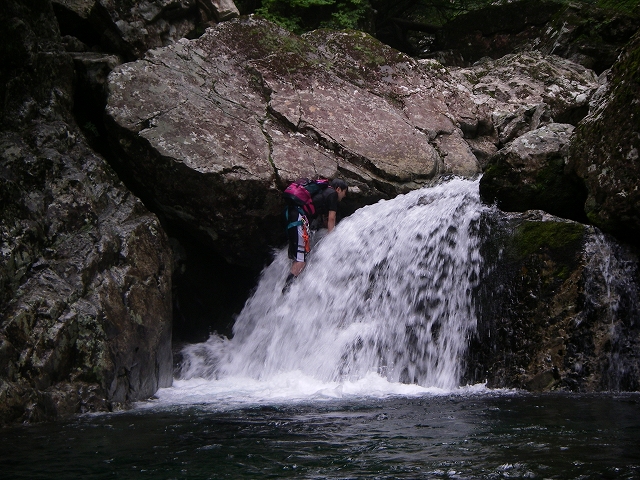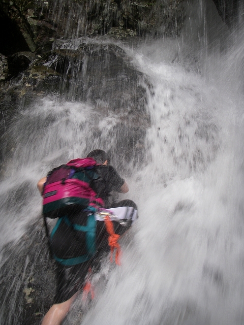シャワーで登るakatomoさん。今日は5年振りの沢登りらしい。