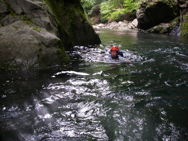 小滝を超え淵を泳ぎ、黒倉又谷出合の6mを見上げる。