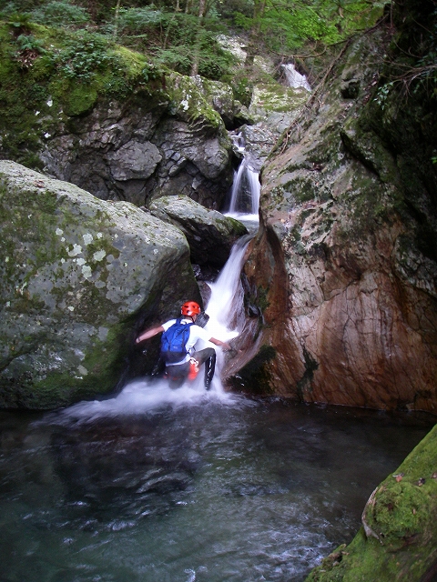 釜を持った3mに泳いで取り付き滝身を這い上がり、その上にも釜を持った小滝が続く!