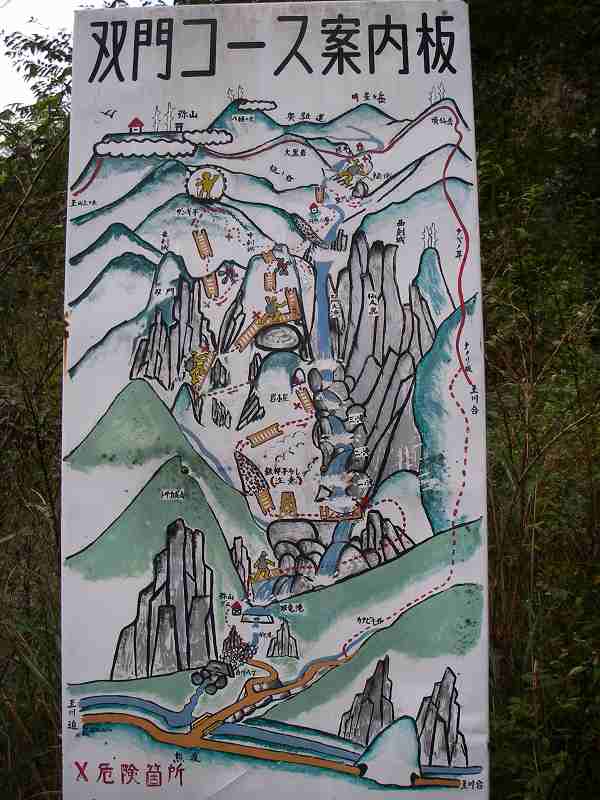 「つぎはこの滝を真下から見に行こう」とか「あのチムニーは突っ張りで登れるぜ!」とか言いながら滝見物・・まぁ冗談はさておいて、双門ノ滝を後にし、またハシゴの激登りに戻ります。。