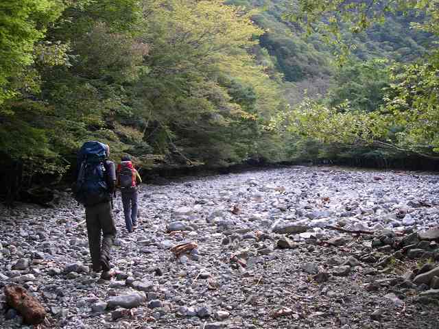 土曜夜24時半、熊渡の駐車スペースに車を止め小宴のあと2時頃就寝。6時起床で外に出るとまずまずの空模様。早速準備と朝食を済ませて6時50分に林道の車止めをくぐり、約40分の林道歩きで弥山川に下り立ちました。