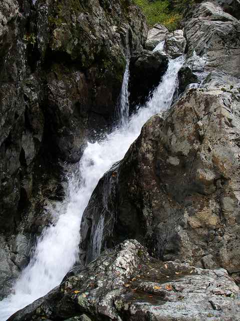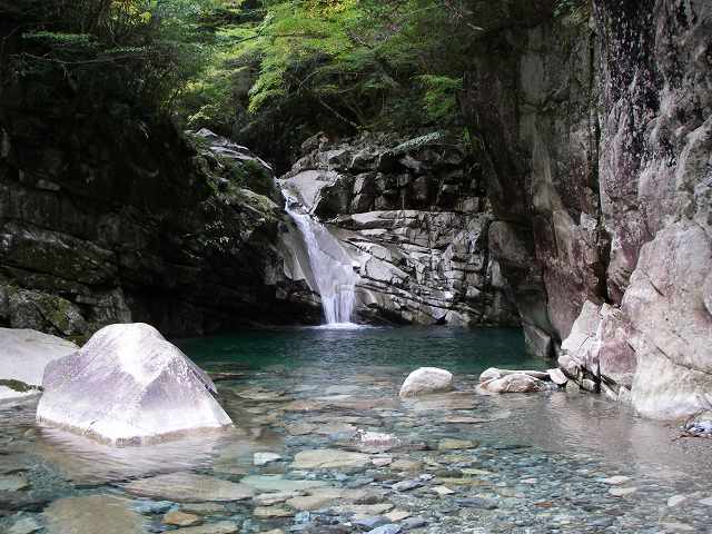 水の流れが出てきて両岸が狭まってくる頃、谷がぐいっと右に曲がるとガマ滝に出会う。釜はエメラルドグリーン、川は透明で美しい流れです!