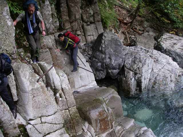 前方に先行者2名がへつりで難儀してるのが見えます。