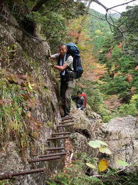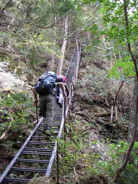 立派なつり橋を渡り、踏み跡を辿ると出ました鉄ハシゴ!このコースには80以上のハシゴが架けられているとか。ここからしばらくの間、ハシゴや鎖を使ったり根っこを掴んだり岩の間を潜ったり?激登りが続きます!痩せ尾根に架けられたハシゴに、設置した人の苦労を想像しそして感謝しながら・・・谷底には一ノ滝から上に続く深いゴルジュが覗き見えますねぇ~。
